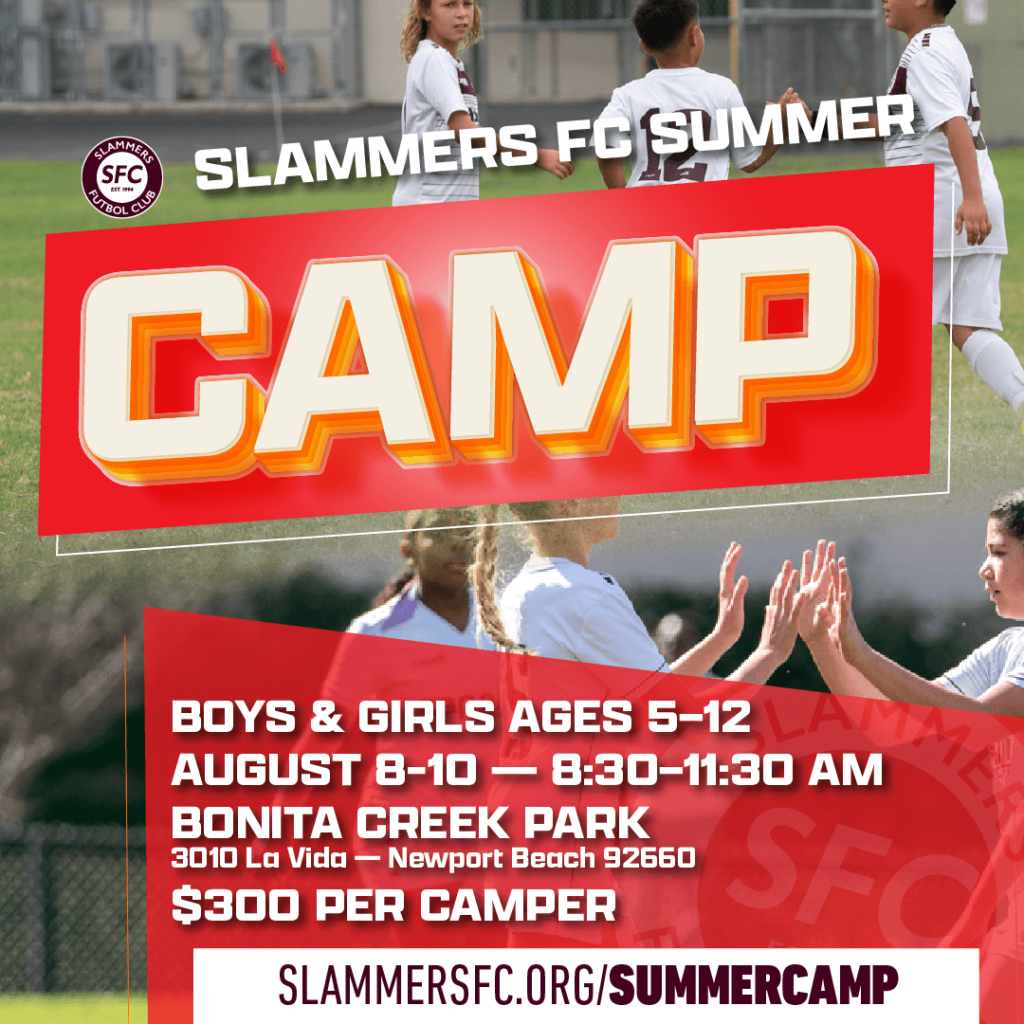 DETAILS: Boys and girls ages 6-12 August 8–10 Bonita Creek Park. Our SFC coaches can’t wait to host some technical, fast-paced, FUN sessions for you. Register today at slammersfc.org/summercamp!